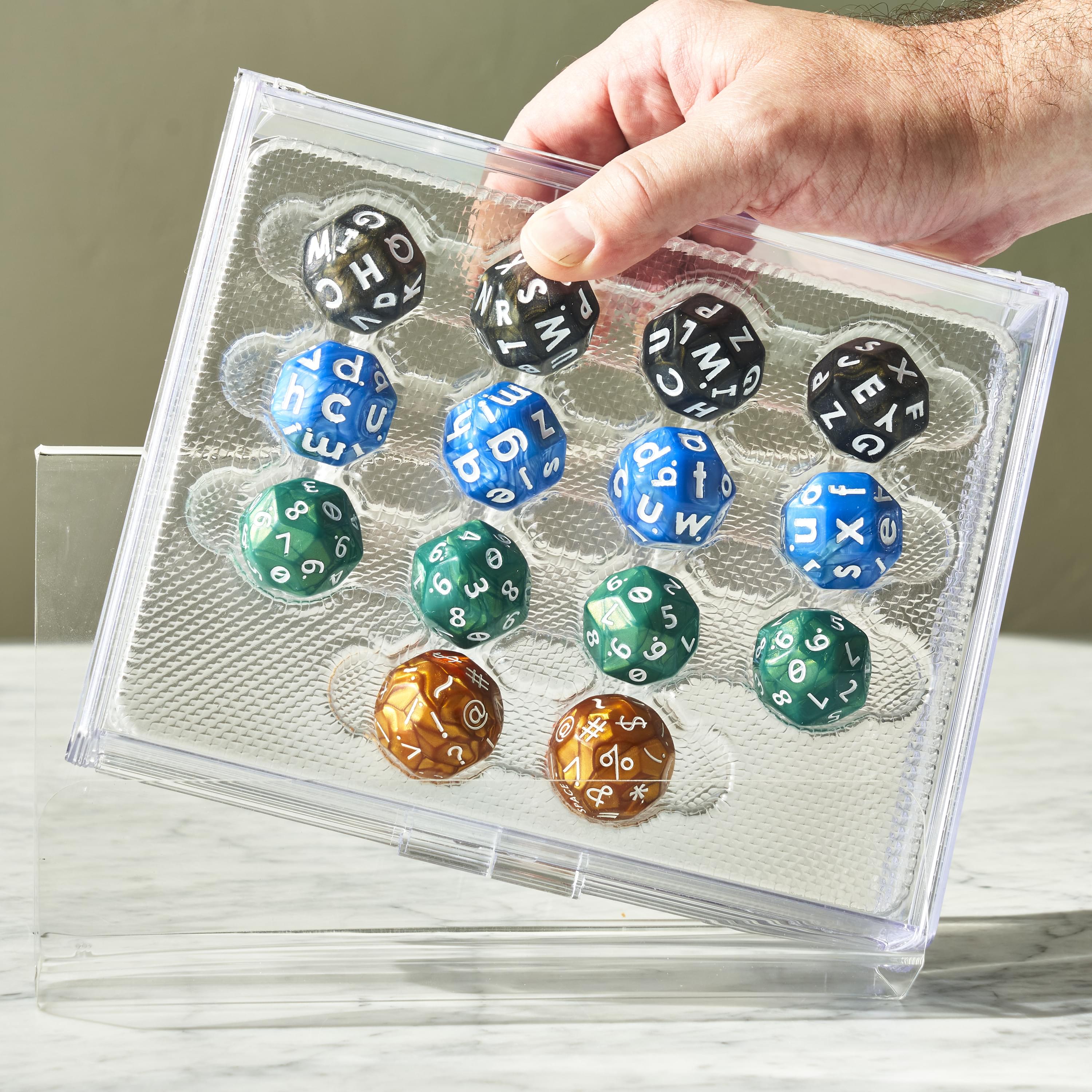 Fun, Kinetic, Colorful: a matching set of 14 large dice. When rolled together, they create modern passwords composed of uppercase letters, lower case letters, numbers, and special characters.